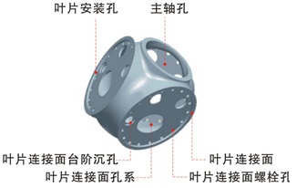 轮毂是风电机组重要的零部件之一,其结构和受力变形复杂,它将直接影响到风力发电机组的正常运行和使用寿命。因此它具有强度高、可靠性好、疲劳寿命长、吸振性强等特性,以满足–40~–20℃的使用工况。常见的材质为铸态低温高冲击韧性球铁。轮毂的主要机加工类型为铣削、镗削和钻削。